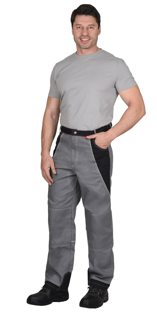 Брюки прямые, изготовлены из ткани "Панакота Комфорт", с застёжкой спереди на молнию, с притачным поясом на пуговице, с внутренними боковыми карманами и наколенниками, с усилительными накладками по шаговому шву и по низу брюк, с накладными задними карманами, с карманом для инструментов. На задних половинках предусмотрен СВ кант для сигнальной видимости.