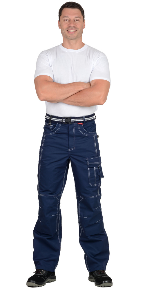 Брюки прямые, на притачном поясе, с застёжкой спереди на молния, с боковыми внутренними карманами, с часовым карманом; на задних половинках с отрезной кокеткой, двумя накладными карманами и карманами под инструменты. В брюках предусмотрен СВ кант для обозначения сигнальной видимости.