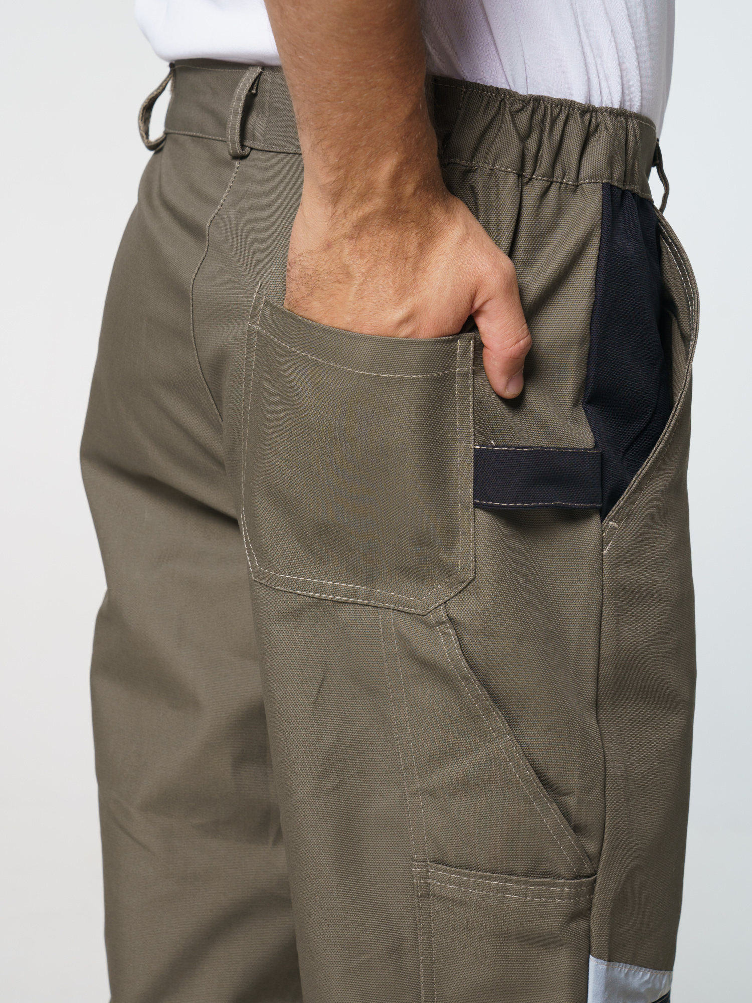 Брюки ФАВОРИТ-МЕГА прямые; с застёжкой гульфика на тесьму - «молния»; с застежкой пояса на одну петлю и пуговицу; с боковыми внутренними карманами; с карманами и фигурными клапанами застегивающиеся на потайную липучку на боковом шве; с фигурным карманом на задней половинке; с карманами под инструменты; с наколенниками. Пояс брюк частично стянут резинкой ткацкой по бокам. В брюках предусмотрена лента светоотражающая (мелкодисперсная белая) 50 мм фигурной формы.