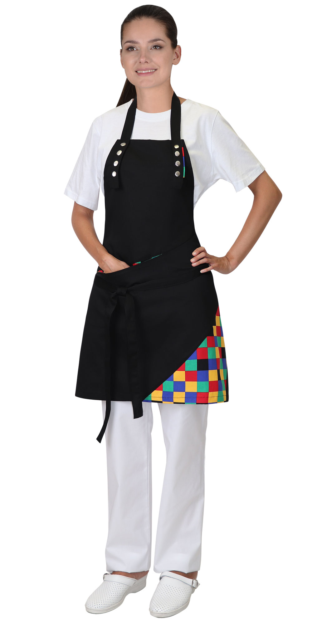 Фартук с нагрудником и с боковыми завязками для регулировки объема. Съёмная шейная бретель, пристёгивающаяся на кнопки. На шейной бретели с левой стороны вставлена отделочная деталь из отделочной ткани. В нижней части фартука расположен карман, выполненый из отделочной ткани. С левой стороны отрезная декоративная деталь из отделочной ткани.