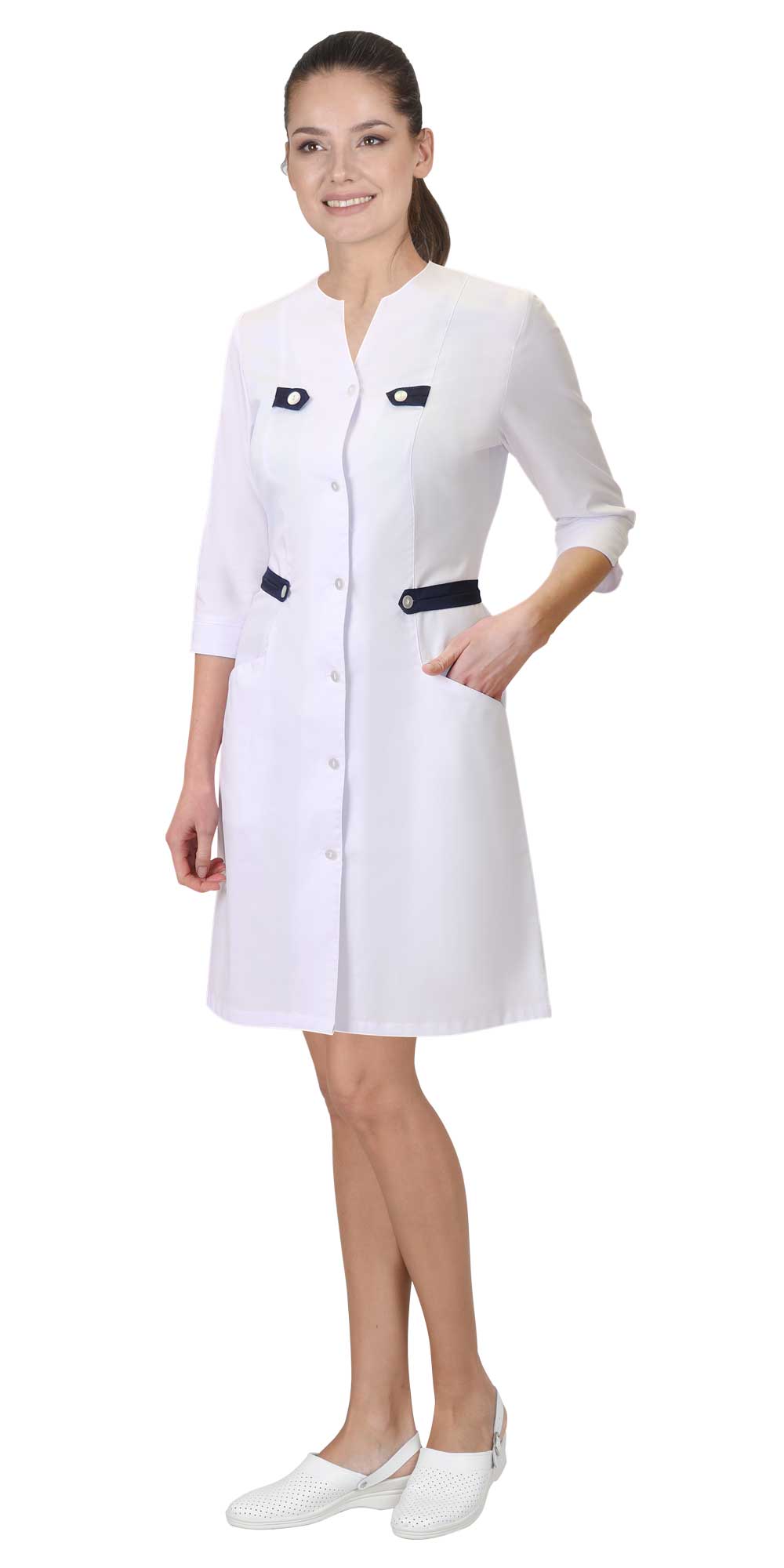 Халат полуприлегающего силуэта с центральной застёжкой на пуговицы. Без воротника с фигурным вырезом горловины. Два кармана в рельефных швах. Рукава втачные длиной 3/4.