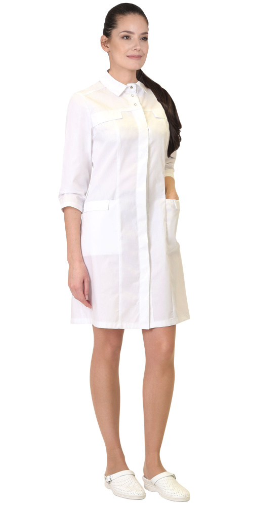 Халат женский полуприлегающего силуэта, с втачным отложным воротником с отрезной стойкой, с центральной застёжкой на 3 кнопки вверху и от кокетки с супатной застёжкой на 6 пуговиц, с внутренними боковыми карманами. Рукава втачные 3/4.