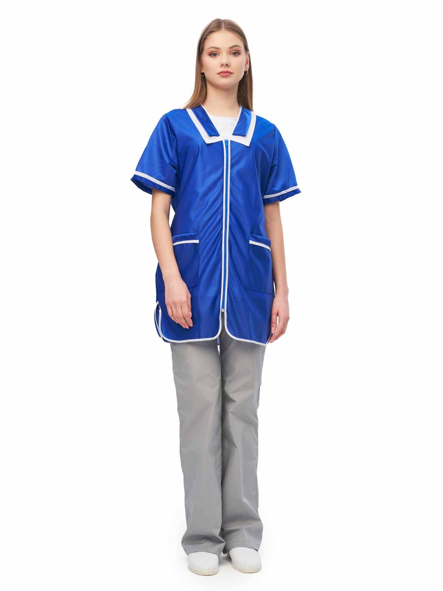 Халат с декоративным воротником, с большим функциональным карманом, разделенным на две части. Рекомендуется для работниц сферы обслуживания, технического персонала гостиниц, для работников торговли.