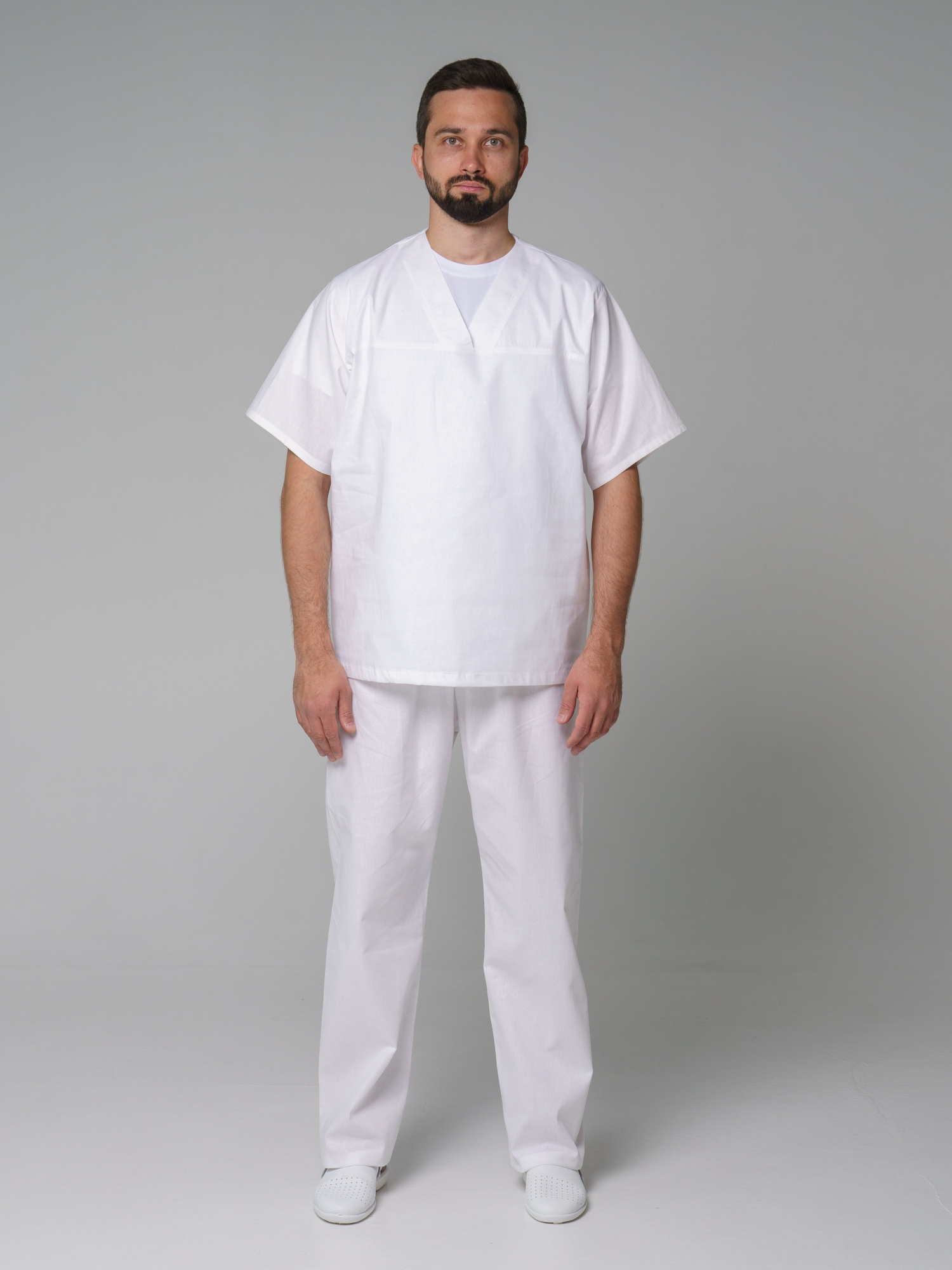 Костюм состоит из блузы и брюк. Блуза с V-образным вырезом горловины. Брюки с резинкой в поясе.