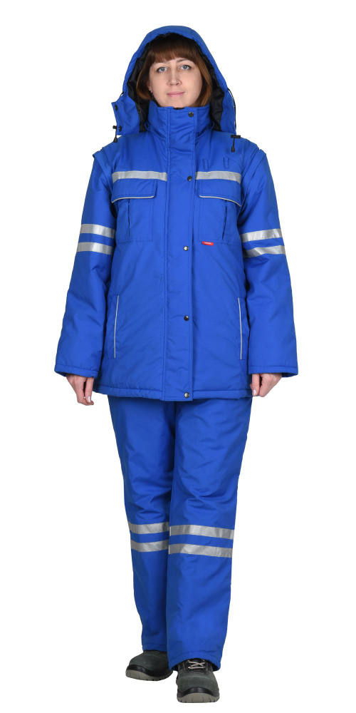 Костюм состоит из куртки и полукомбинезона. Куртка удлиненная прямого силуэта на утепленной подкладке. Центральная застежка - молния, прикрыта ветрозащитной планкой застегивающейся на кнопки. Два верхних кармана и два нижних прорезных кармана. Утепленный пристегивающийся на кнопки капюшон. Пристегивающиеся при помощи молнии рукава. Полукомбинезон на утепленной подкладке с застежкой на молнию. Два нижних кармана с косым входом и один задним накладным карманом. В костюме предусмотрены светоотражающие полосы 25мм для обозначения сигнальной видимости.