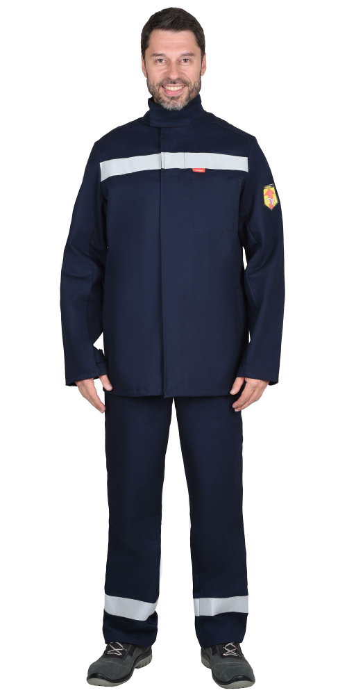 Ткань верха: "FIRE RESISTANT (FR 330)" состав: 100х/б с огнестойкой отделкой. Цвет: темно-синий.Куртка прямая, удлинённая с центральной бортовой супатной застёжкой на шесть обметанных петель и пуговиц, с отложным воротником, с нижними карманами в рельефах, с внутренним нагрудным карманом на левой полочке, отверстиями для воздухообмена под проймами на спинке и на полочках, на кокетке. Рукава втачные, по низу рукава хлястики, застегивающиеся на пуговицы. В куртке предусмотрен СОП шириной 50мм огнестойкий для обозначения сигнальной видимости. Детали: пояс передний половинки, пояс задней половинки, мешковина кармана куртки, мешковина кармана брюк, внутренний карман.Костюм 1 класс защиты, предназначенный для защиты работающих от повышенных температур, для эксплуатации на расстоянии до источника брызг металла, окалины не менее 2 м., кратковременным воздействием открытого пламени, контактом с нагретыми поверхностями или сочетанием перечисленных тепловых факторов.Брюки прямые, с притачным поясом на задних половинках застегивающийся на пуговицы, с цельновыкроенным поясом на передних половинках, с 6 шлевками, с карманами в боковых швах, с накладным карманом на правой передней половинке, с вытачками на задних половинках. В брюках предусмотрен СОП шириной 50мм огнестойкий для обозначения сигнальной видимости.