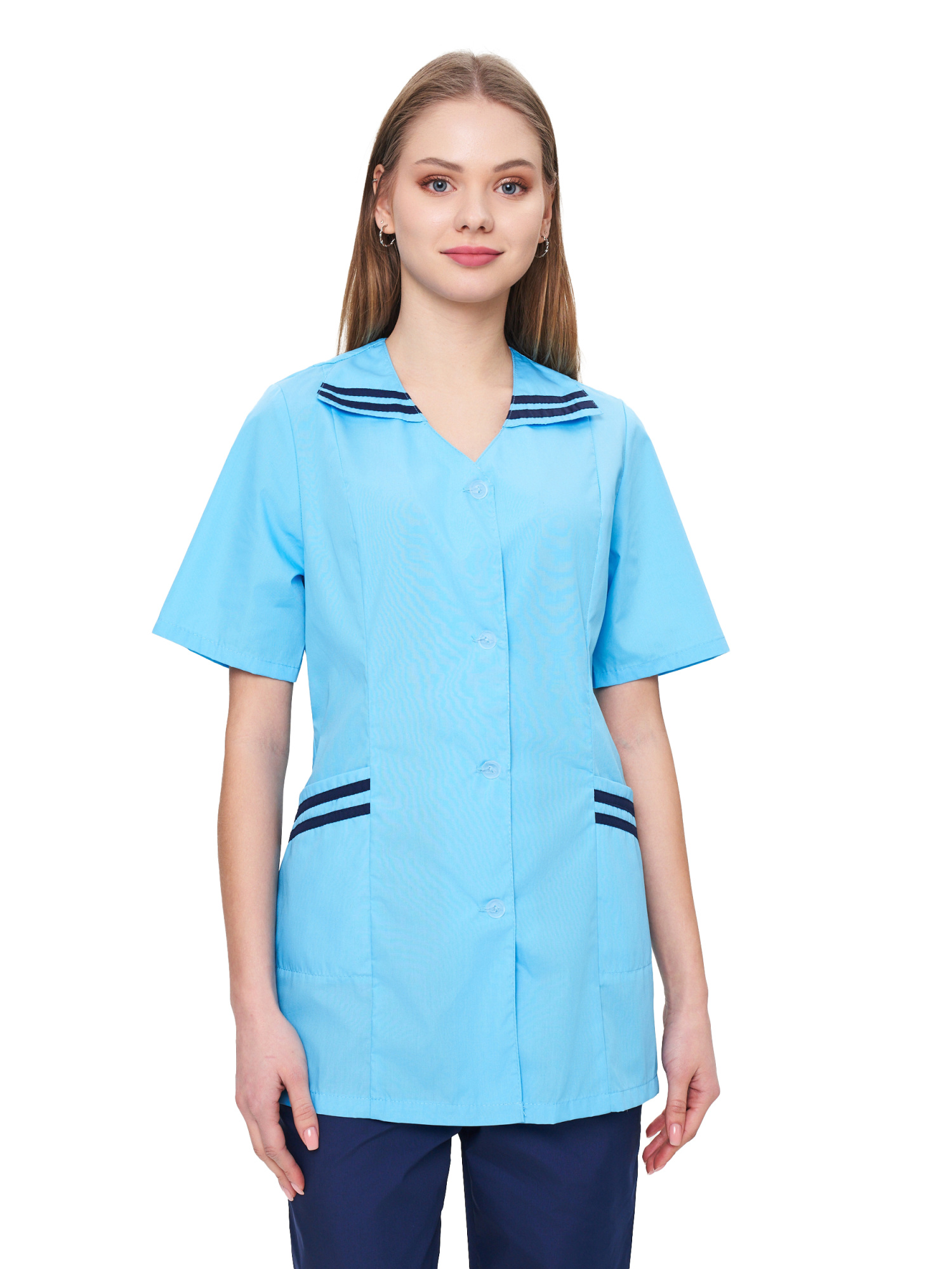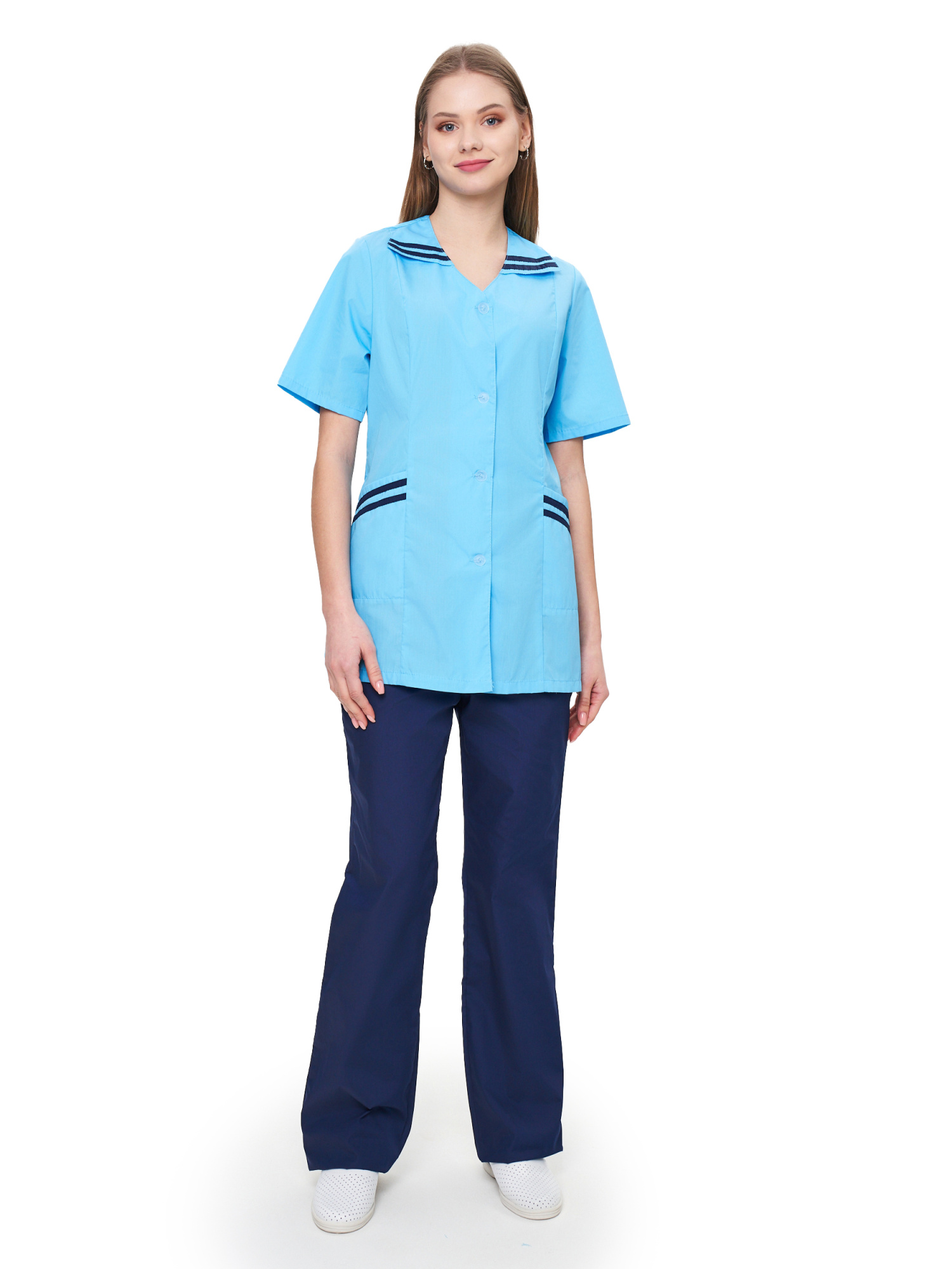 Современный удобный женский костюм со свободной посадкой, рекомендован для сферы обслуживания, клининга, гостиничного бизнеса (HORECA) из высококачественной смесовой ткани убережет от загрязнений и послужит отличным помощником в решении задач любой сложности. Костюм для горничных и уборщиц прост в уходе, не мнется и быстро сохнет, а материал долгое время сохранит свой первоначальный яркий цвет. Костюм состоит из блузы светло-голубого цвета и брюк темно-синего цвета. Спецодежда для горничных является особенным видом профессиональной униформы. Она создана для сферы обслуживания, работники которой всегда должны выглядеть безупречно. Одежда для горничных строго регламентируется администрацией гостиницы или отеля, поэтому ее состоянию уделяется большое внимание. Костюм состоит из прочной смесовой ткани ТИСИ, отталкивающей различного рода загрязнения. Материал устойчив к пятнам и истиранию, тем самым уборщицы всегда будут выглядеть опрятно и привлекательно.
