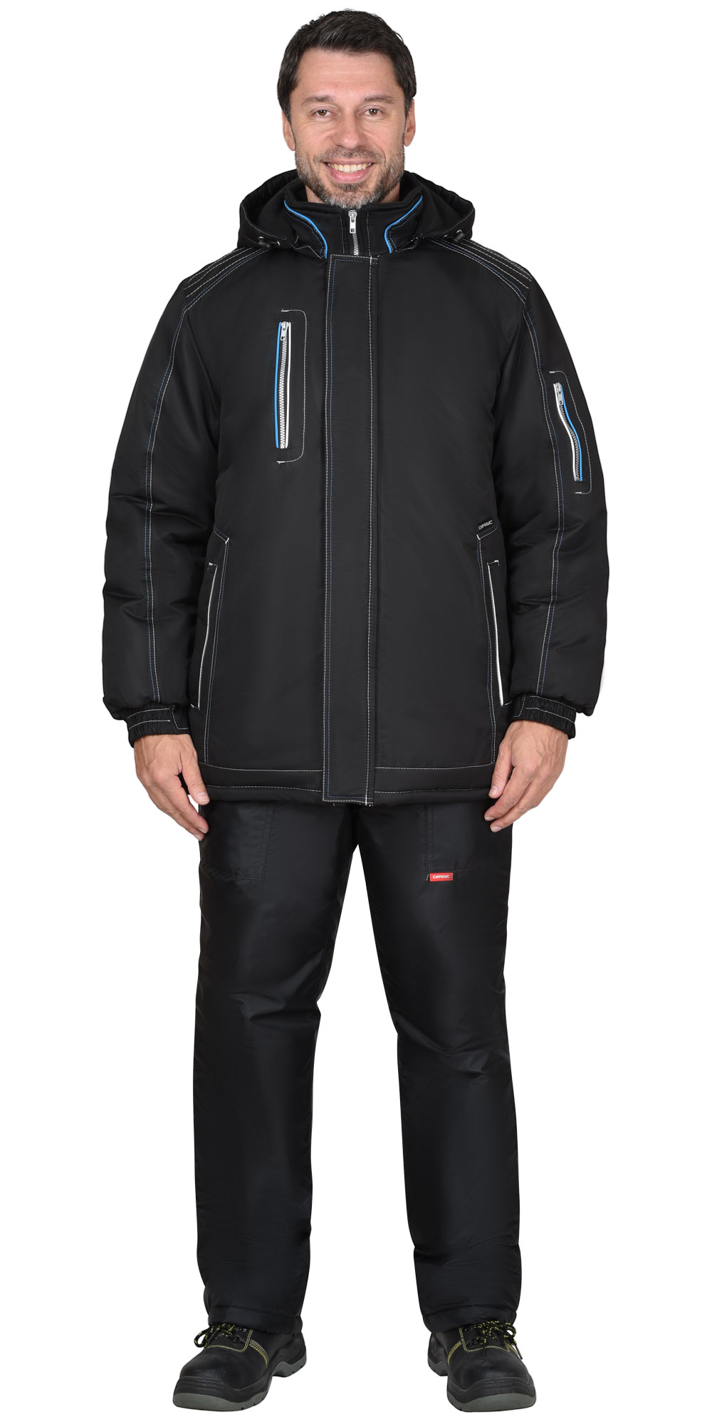 Куртка длинная, прямого силуэта, с притачной утеплённой подкладкой и съёмным капюшоном, с воротником-стойка, с центральной бортовой застёжкой на тесьму - «молния», с ветрозащитной планкой застегивающейся на ленту «контакт» и с подпланкой, с верхним и нижними прорезными карманами. Рукава втачные с манжетами, частично стянутыми на резинку, на левом рукаве карман на тесьму – «молния», с внутренним карманом с молнией. Куртка с контрастными кантами по карманам и воротнику