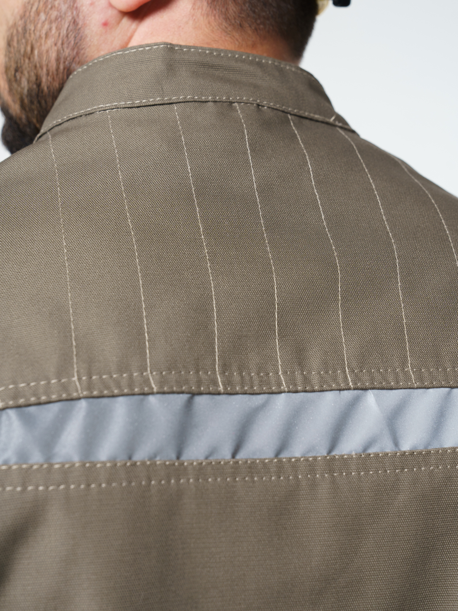 Куртка прямого силуэта; короткая; воротник стойка; с центральной застёжкой на молнию; с верхними фигурными карманами с фигурными клапанами; низ регулируется при помощи хлястиков с полукольцами. На куртке есть СВ элементы.