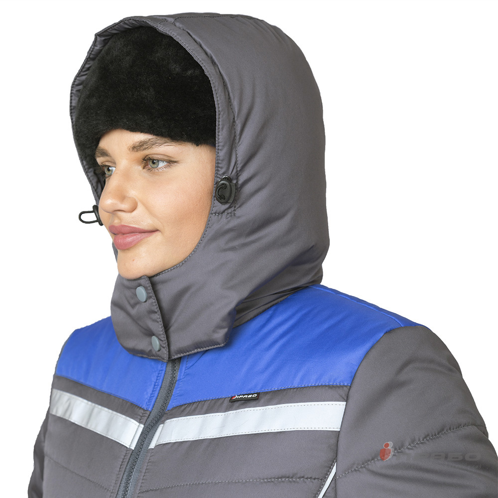 Капюшон: утеплённый съёмный, пристёгивается к горловине на молнию. По лицевому вырезу кулиска с эластичным шнуром и фиксаторами обеспечивает возможность регулировать капюшон по объёму. Подбородочная часть широкая, застёгивается на кнопки.