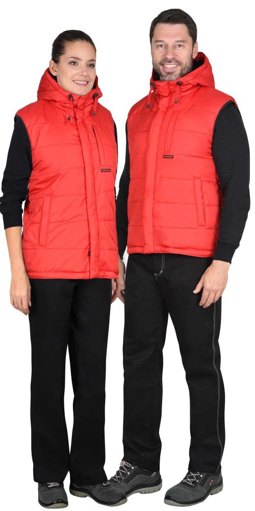 Жилет утеплённый, выстеган с утеплителем горизонтальными строчками, на флисовой подкладке контрастного цвета, с втачным капюшоном, с застёжкой на молнию, прикрытую ветрозащитным клапаном от края капюшона до низа изделия, застёгивающимся на кнопки. Жилет с одним нагрудным карманом с молнией и двумя нижними карманами. Спинка жилета, удлинённая с фигурной линией низа. Пройма окантована резинкой. Объём капюшона по лицевому вырезу регулируется шнуром с фиксаторами.